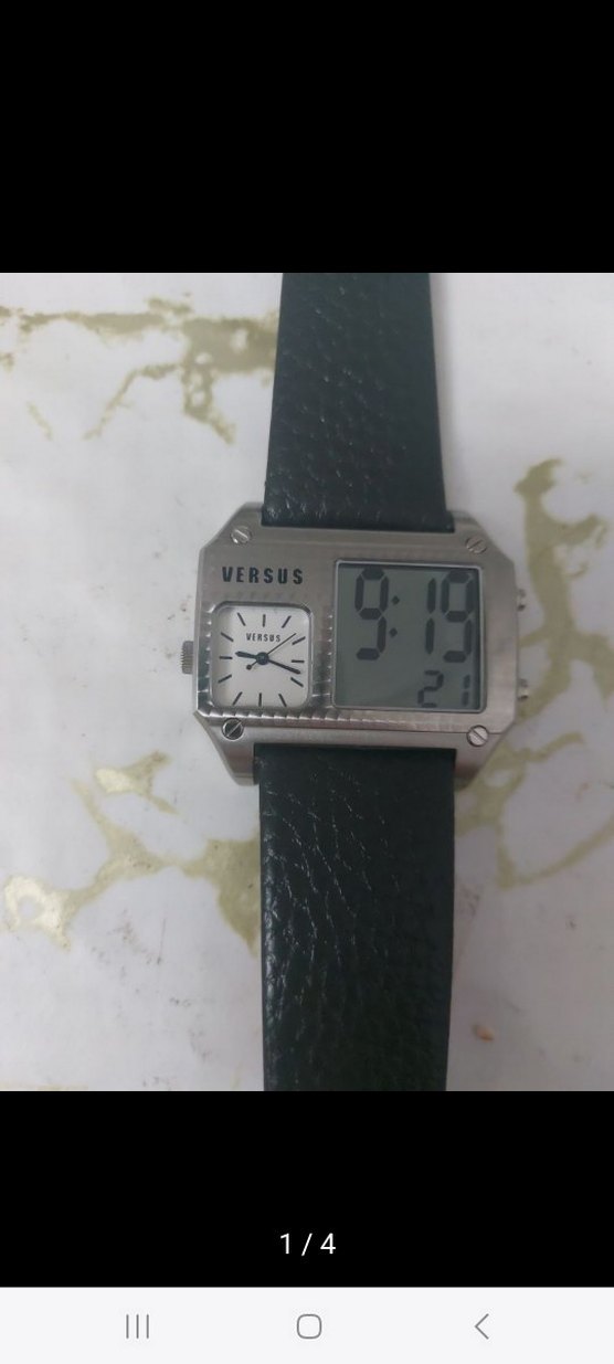 Versus marka, analog ve dijital çift ekranlı, gri ve beyaz renklerde erkek saati. Siyah dokulu kayış ve dikdörtgen metal kasa içerir. ⌚
