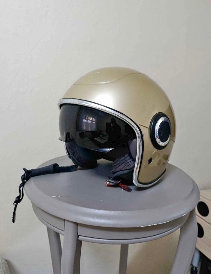 Bej renkli, retro tarzda seramik motosiklet kaskı. Tokalı kayış ve koyu vizöre sahip, rock punk havası verir. Desensiz ve hafif.