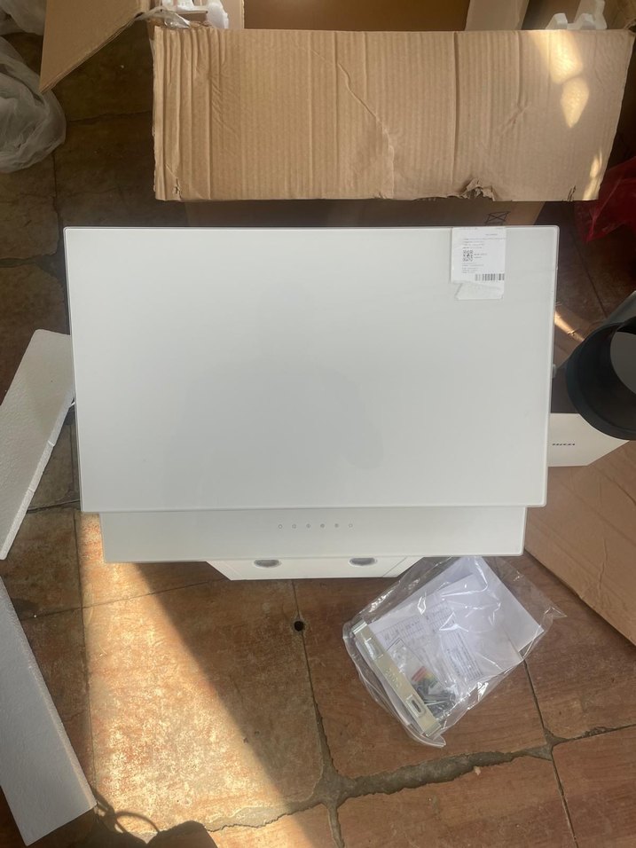 Paket ve aksesuarlarıyla birlikte sunulan temiz tasarımlı beyaz davlumbaz/aspiratör. Vestel marka ankastre davlumbaz kutulu paketli sıfır ürün. Beyaz gri ve antrasit renkleri mevcut.