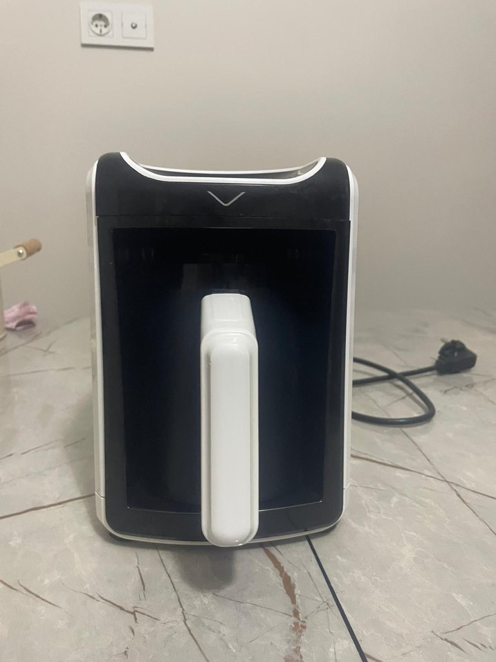 Önden tutma sapı bulunan beyaz ve siyah renkli havalı fritöz, az yağla kızartma yapmaya uygundur.