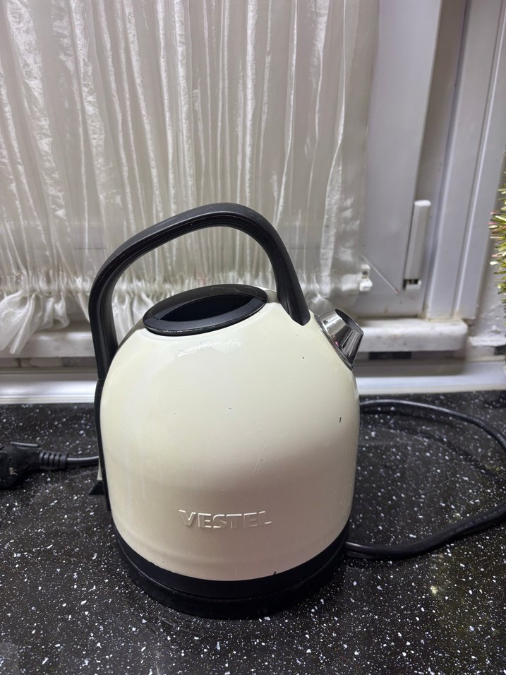 Vestel marka beyaz su ısıtıcı, siyah sap ve taban ile hızlı su kaynatma sağlar. Kompakt ve kullanışlı mutfak aleti. bir iki yerinde minik nokta kadar renk atması var.Kullanıma engel değildir.#Vestel