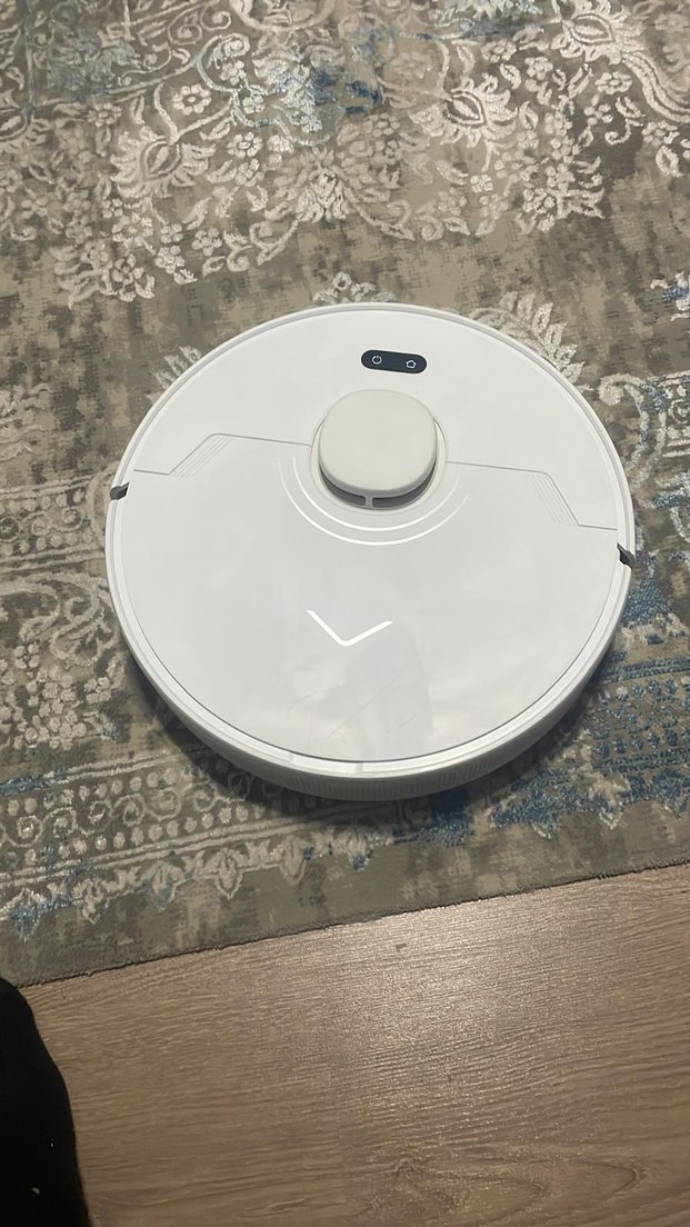 Beyaz ve gri renkte, dairesel tasarıma sahip robot süpürge, otomatik zemin temizliği için uygundur.