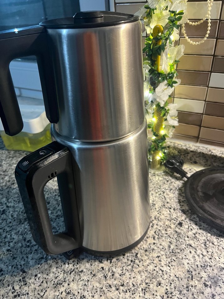 Gri çelik çay makinesi, sağlam sap ve kullanımı kolay kontrol düğmeleriyle modern tasarıma sahiptir. İki yıl önce aldığım için fatura ve garanti belgesi durmuyor. Yenisini aldığım için bunu satacağım herhangi bir sorunu yok sağlamdır ve çalışıyor. Düğmeleri sağlam. Üst demlik sapında bi erime var ama kullanıma engel değil. Sıcak tutma özelliği var kaynaması bitince sıcak tutma özelliğine otomatik geçiş yapar makul teklifleri kabul edebilirim komisyon aldığı için aşırı bir indirim yapamayabilirim alana şimdiden hayırlı olsun.