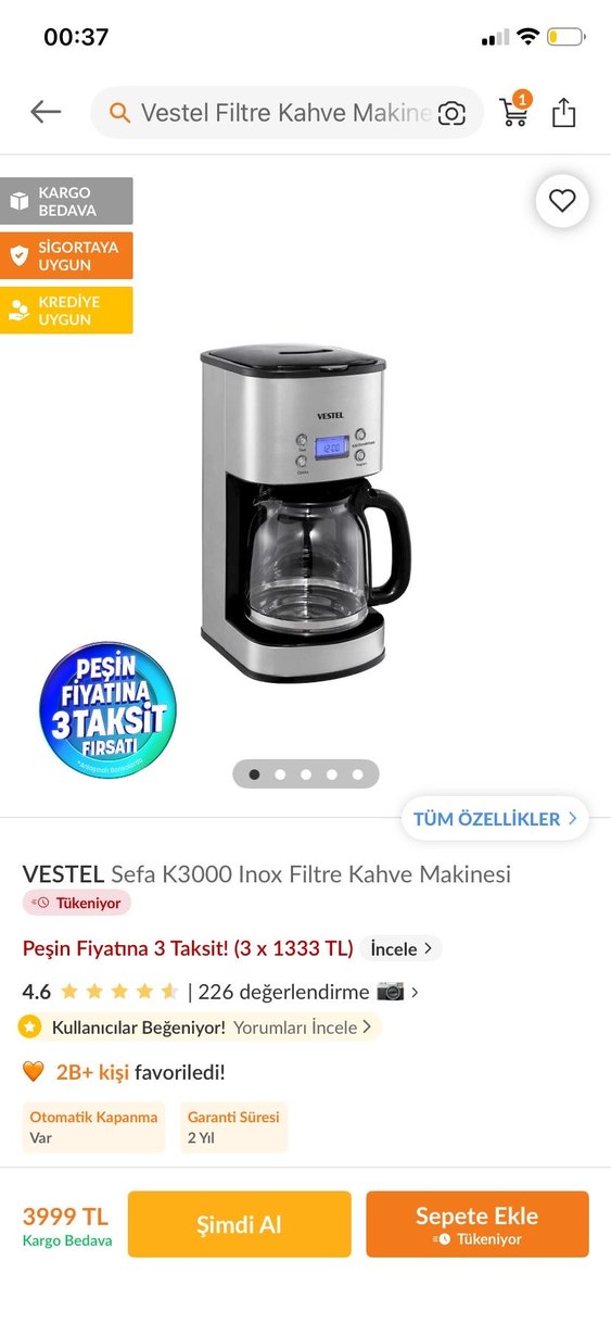 Vestel Sefa K3000 Inox gri renkli, cam sürahi ve dijital ekranlı filtre kahve makinesidir. Basit kontrol butonlarına sahiptir. ☕ espresso makinesi aldığım için satıyorum