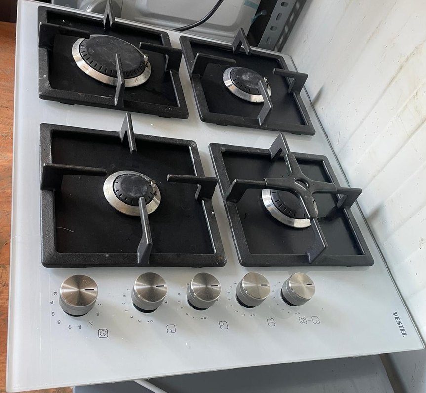 Dört gazlı brülöre ve metal kontrol düğmelerine sahip beyaz ve gri mutfak cihazı.
