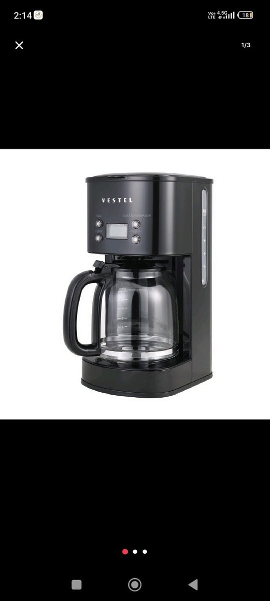 Vestel siyah kahve makinesi, cam sürahi ve dijital ekran ile pratik kahve demleme imkanı sunar. ☕
