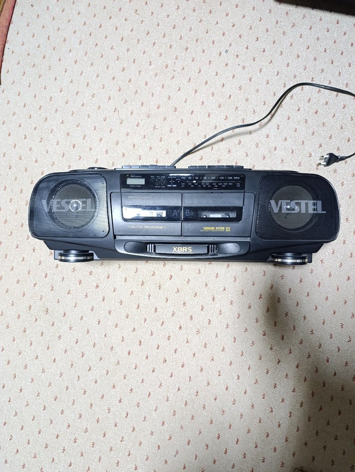 Kutulu siyah Vestel müzik sistemi, yerleşik hoparlörler ve kaset çalar ile. Kompakt tasarım ve kullanımı kolay kontrol düğmeleri.