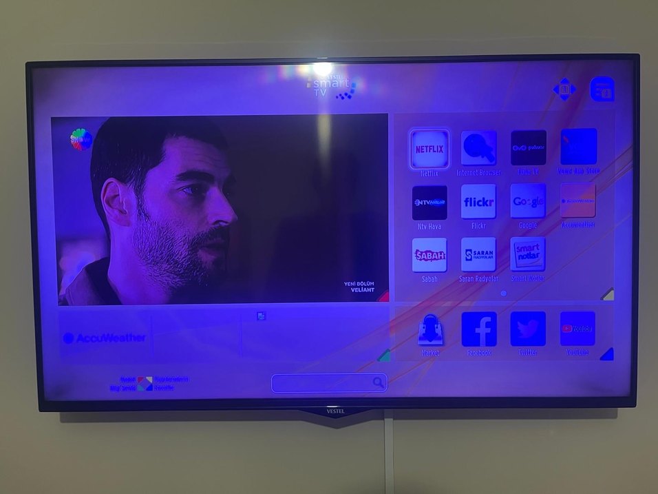 Vestel Smart Tv 109cm Kablosuz internet (Wi-Fi) ve Uydu alıcısı çalışır durumda. Netfiliks ve YouTube uygulamalarına sorunsuz giriş yapıyor. Ekranda hasar, çizik yok. Renkler malum zamanla soldu. Hoparlörü çalışır durumda. Duvar askı aparatı yok. Sadece Kendi ayakları var. Kumandası yakın zamanda yeni alındı.