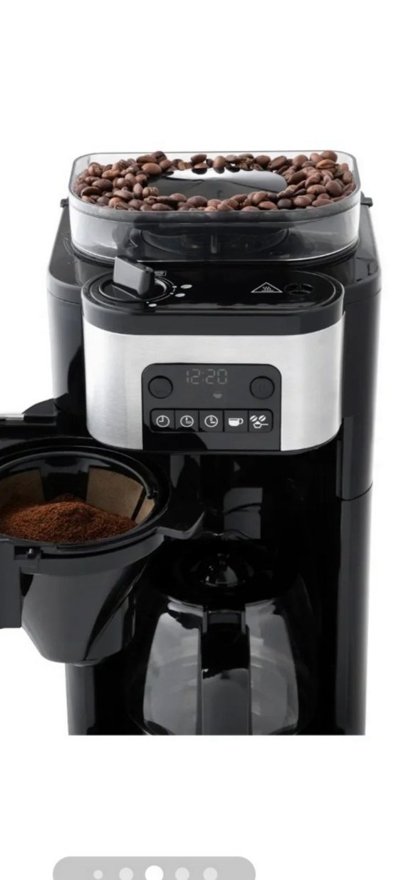 Dijital ekranlı, yerleşik öğütücülü ve filtre sepetli siyah kahve makinesi. Paslanmaz çelik ve siyah detaylarla modern tasarım. ☕sıfır kutusunda Vestel ve trendyolda şu an 6 bin kusur