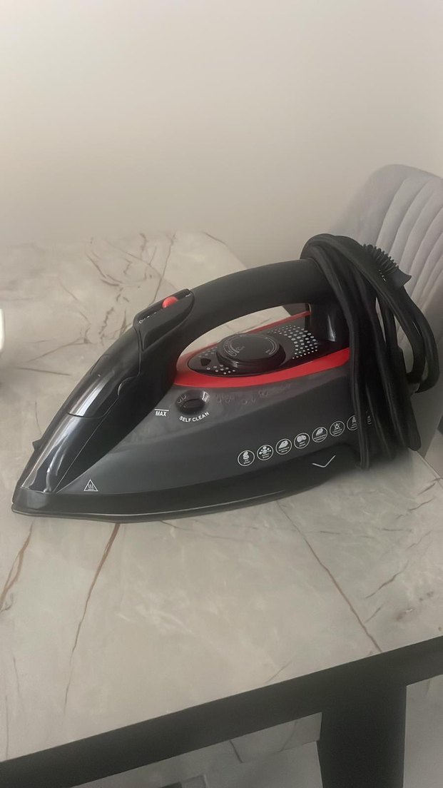 Ayarlanabilir ısı ayarına sahip koyu siyah buharlı ütü, uzun kablosu ile kolay kullanım sağlar.