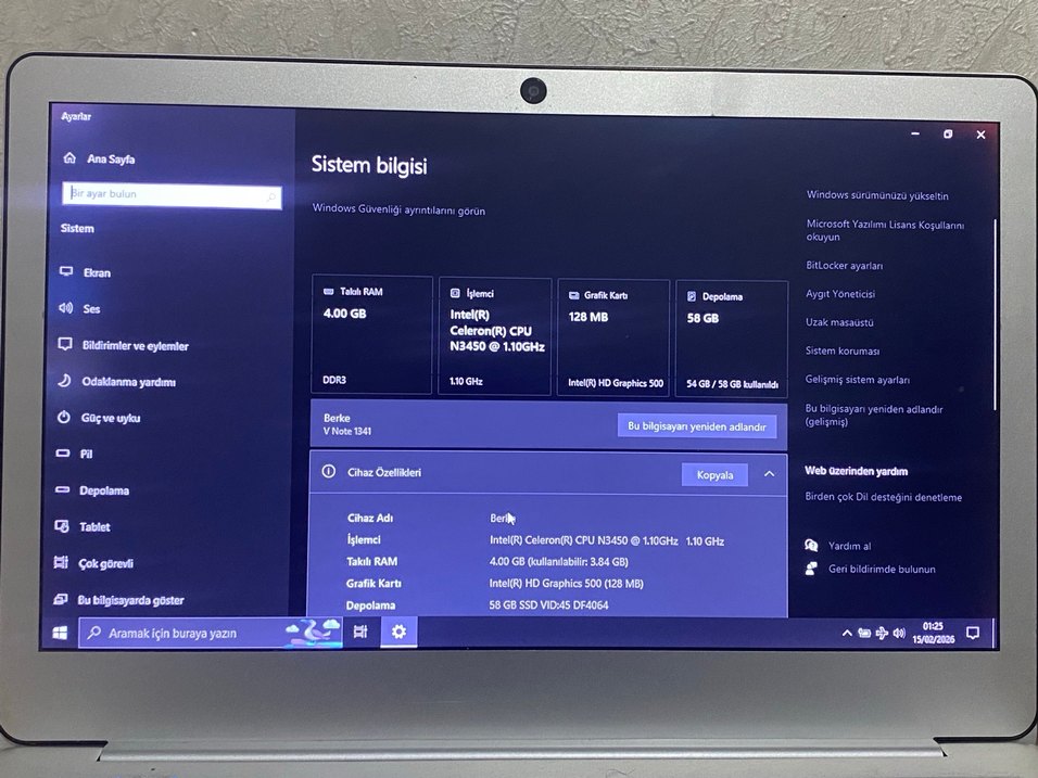 Bataryası 3-4 saati buluyor video film için çok uygundur prize takılı oyun oynarkende donma kasma pek olmuyor tabi seviyesine göre oyunlar için bunlarda kronik klavye sorunu var klavyesi çalışmıyor o yüzden yanında kablosuz klavye maus setide veriyorum. Genelde test edip rahatlıkla oynadığım oyunlar Wolfteam, crysis 1 ve warheas, pes 2018, ets2, minecraft ve Far cry 1-2 Fiyat performans olarak cidden çok başka seviye ekran kalitesi çok yüksek ve windows 10 lisanlı bir şekilde var içinde bütün office programlarını kaldırıyor kasma donma takılma yok günlük kullanım hafif oyunlar video film izlemek için çok uygundur. Intel Celeron N3450 1.10 GHz işlemcili, 4GB RAM, 58GB SSD depolamalı ve 128MB Intel HD Graphics 500 grafik kartlı laptop. Ekran IPS’dir 1920x1080’dir.