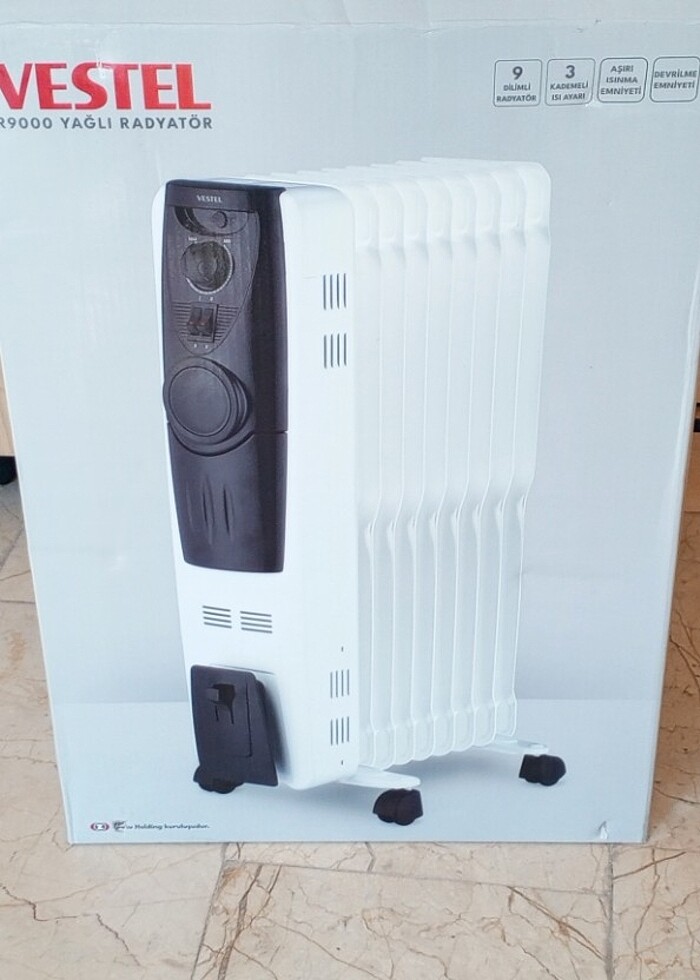Vestel yağlı radyatör ısıtıcı ürün hiç kullanılmamış ve paketindedir 3 kademe güç ayarı LED ışıklı gösterge Termostat özelliği Teknik Özellikler Isıtma Gücü: 2000 W Dilim Sayısı: 9 Devrilme Emniyeti: Var Aşırı Isınma Emniyeti: Var KOD:KMB00115