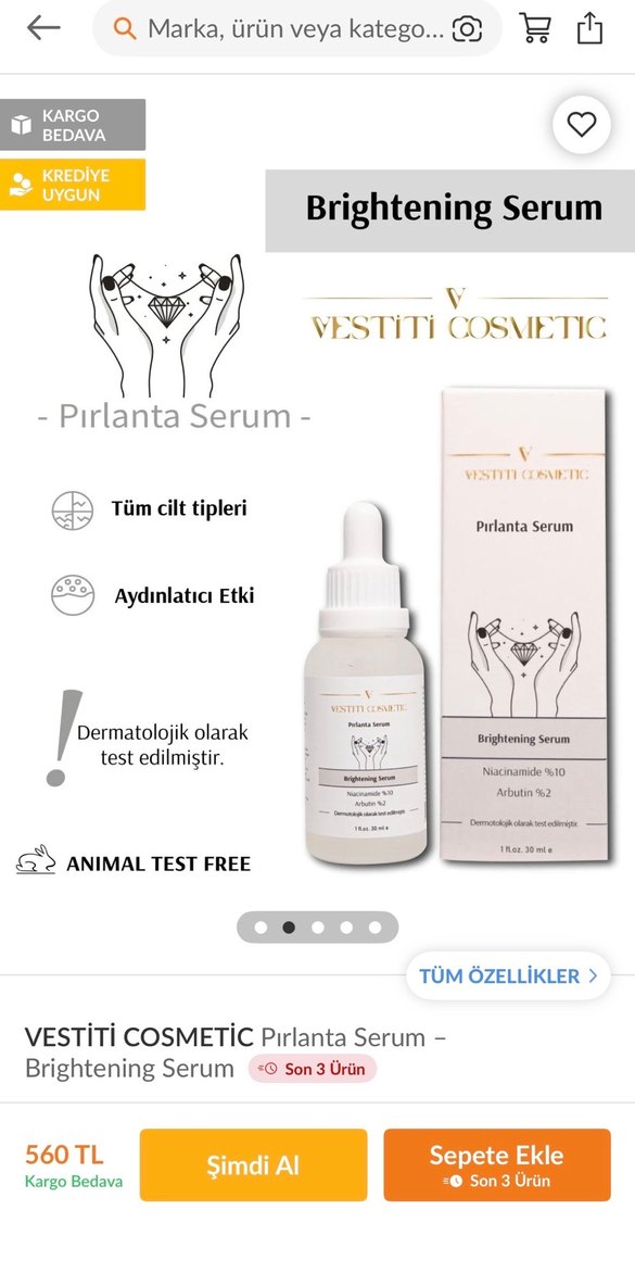 VESTİTİ COSMETIC Pırlanta Serum, tüm cilt tiplerine uygun, dermatolojik olarak test edilmiş aydınlatıcı etkili bir serumdadır.