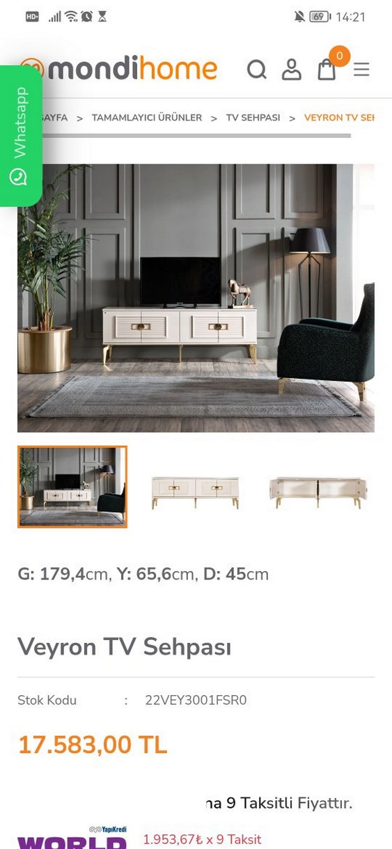 Veyron krem TV ünitesi 179,4 cm genişlik, 65,6 cm yükseklik ve 45 cm derinliğe sahiptir. İki çekmeceli, altın renkli kulplar ve ayaklar bulunur.