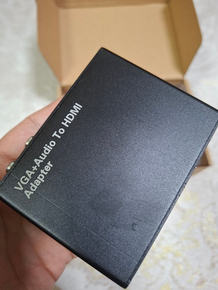 Siyah renkte VGA ve ses sinyallerini HDMI'ye dönüştüren adaptör.