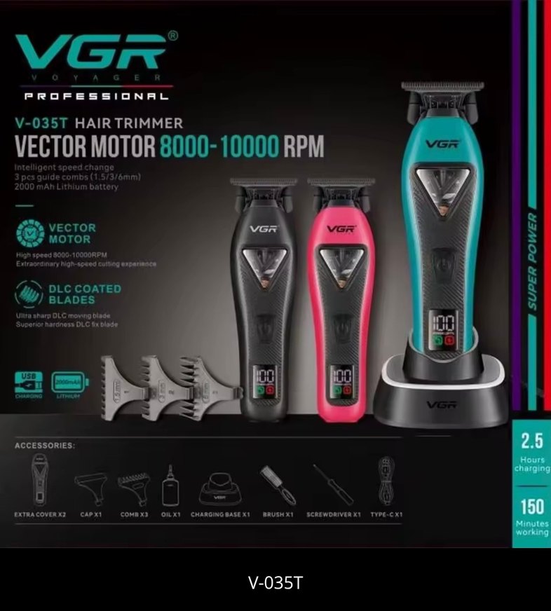 VGR V-035T saç kesme makinesi 8000-10000 RPM motor hızına, dayanıklı DLC kaplı bıçaklara sahiptir. Çoklu taraklar ve şarj standı ile birlikte gelir.
