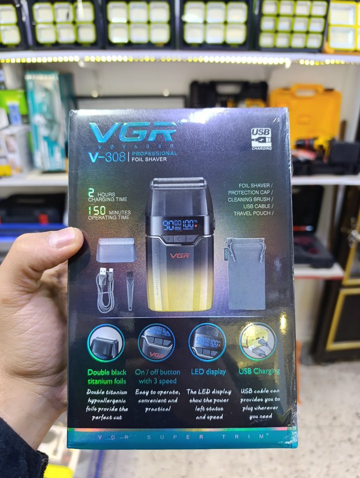 Yurt dışı VGR V-3081 jiletli tıraş makinesi, çift siyah titanyum folyo, 3 hız ayarlı açma/kapama düğmesi, güç ve hız gösteren LED ekran ile USB şarj özelliklerine sahiptir. Koruyucu kapak, temizlik fırçası, USB kablo ve seyahat çantası dahildir. ⏱️