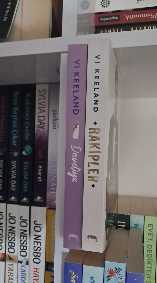 Vi Keeland'in 'Davetiye' ve 'Rakipler' adlı iki romanı, sade kapaklarıyla yer almakta. Biri açık mor, diğeri beyaz renkte.