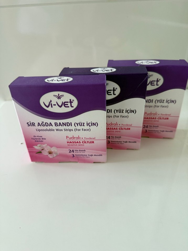Vi-Vet pudralı, hassas ciltler için yüz ağda bandı. 24 şerit ve 3 yağ temizleme mendili içerir.