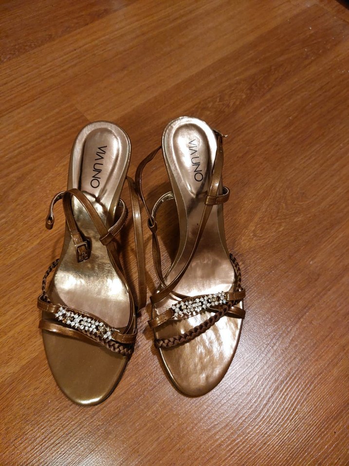 VİA UNO markalı, parlak altın renkli, dolgu topuklu kadın ayakkabısı, yılan desenli ve tokalı, düğün ve özel günler için uygun. BİR KAC TANE TAŞI EKSİK bakır altın karışımı renk