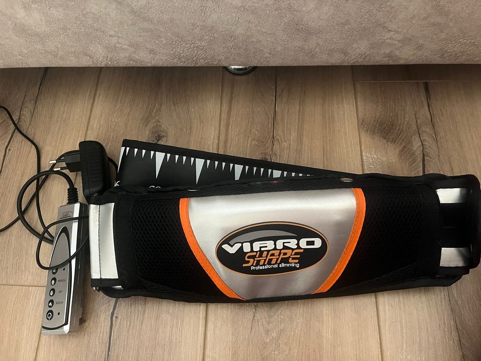 Vibro Shape profesyonel zayıflama kemeri, siyah renk üzerine turuncu ve gümüş detaylara sahip, vücut şekillendirme ve tonlama için tasarlanmıştır.