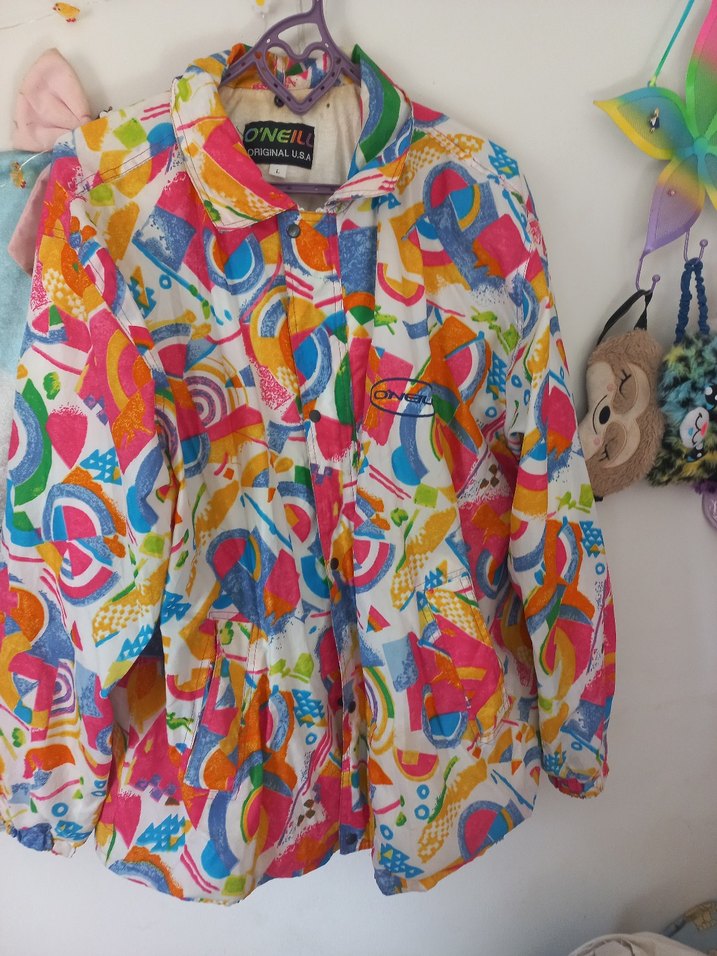 Renkli kız yağmurluğu, salaş kesim, düğmeli ve yuvarlak yakalıdır. Sentetik kumaştan üretilmiş, canlı tie-dye pop kültür desenine sahiptir. Sadece iç yaka kısmında zamanla oluşan bir sararma vardır. Kullanıma engel değildir.