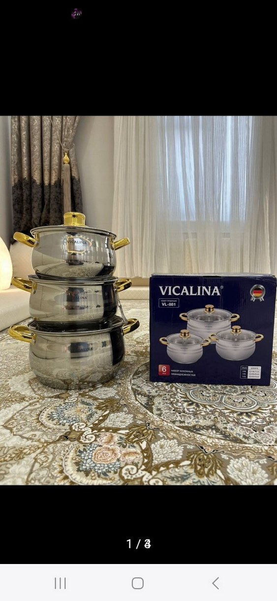 Vicalina markalı, parlak beyaz renkli, 6 parçadan oluşan tencere seti. Cam kapaklı ve altın renkli kulplarla şık tasarım.