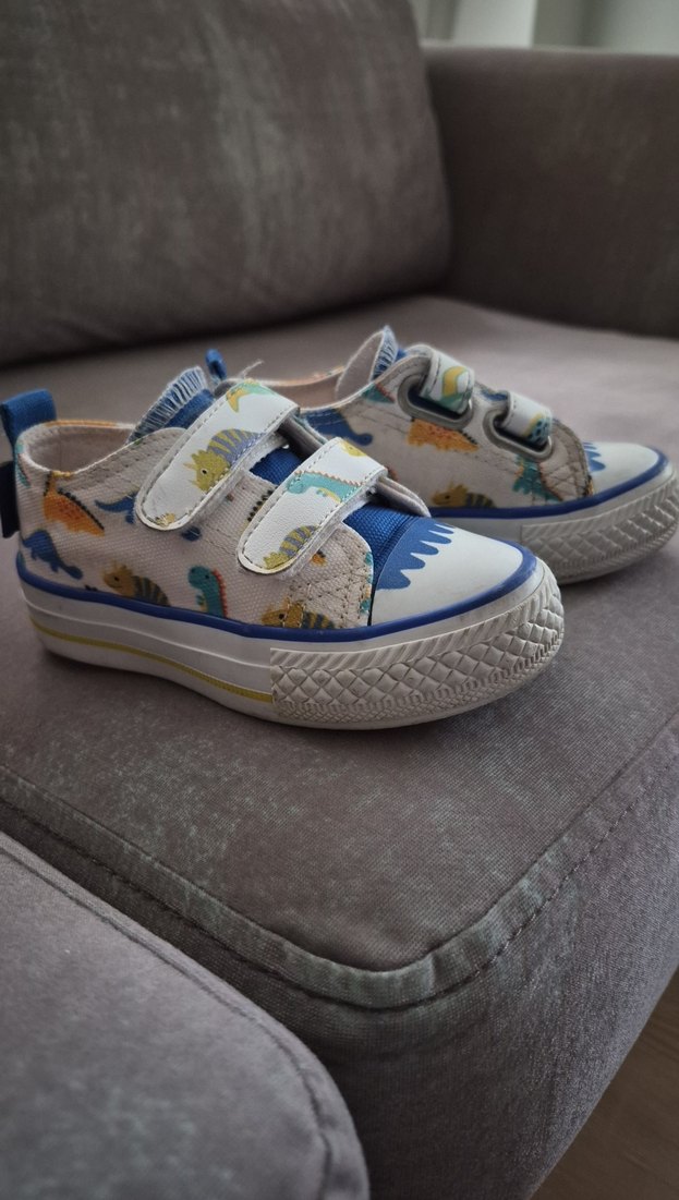 Renkli dinozor baskılı, mavi detaylı ve kolay giyilen cırt cırtlı erkek çocuk spor ayakkabısı. Kauçuk taban dayanıklılık sağlar.
