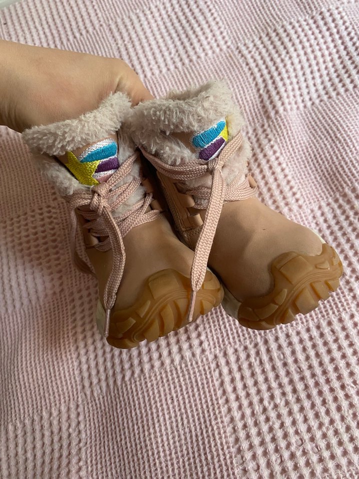 Yumuşak peluş kumaştan yapılmış, bağcık detaylı, bağcıklı ve renkli tie-dye desenli pembe botlar.