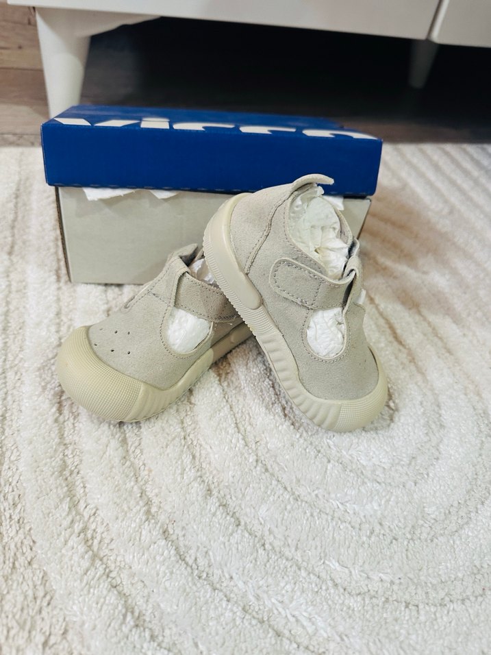 Gri renkli, kauçuk tabanlı, Velcro bantlı bebek ilk adım ayakkabısı. Baskılı desenli, trend sokak giyimi tarzında.