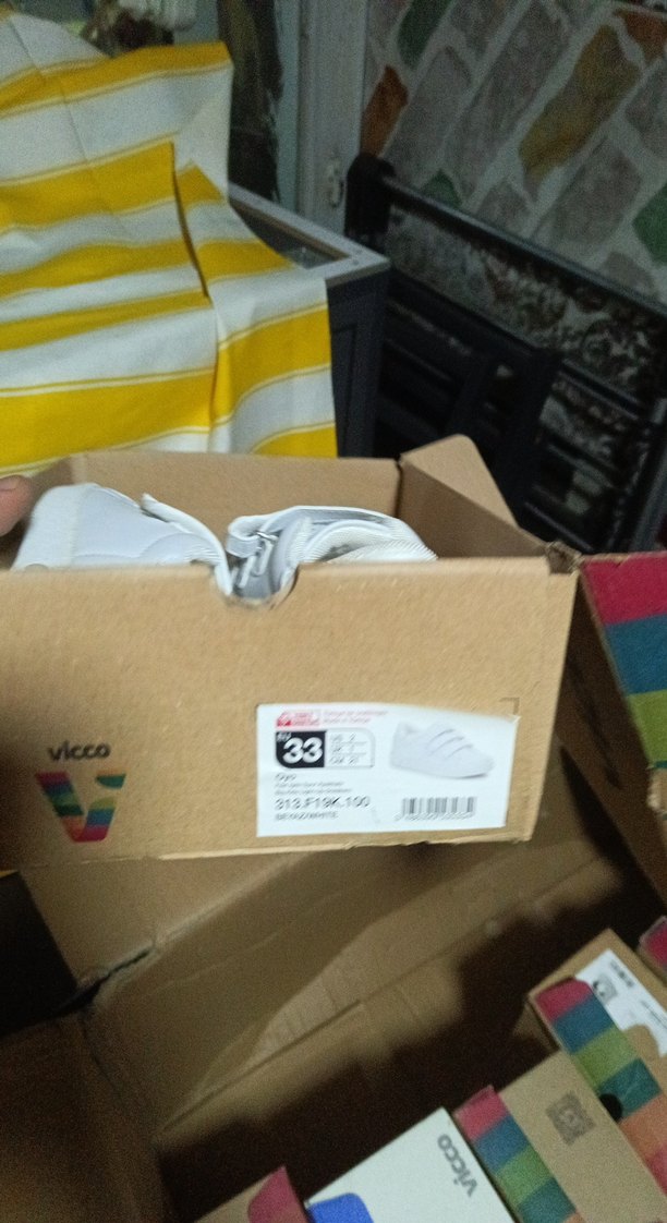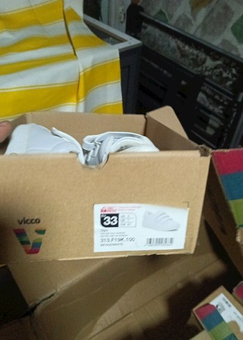 Vicco markalı, 33 numara çocuk ayakkabısı için açık kahverengi karton kutu, içinde beyaz ayakkabılar var.
