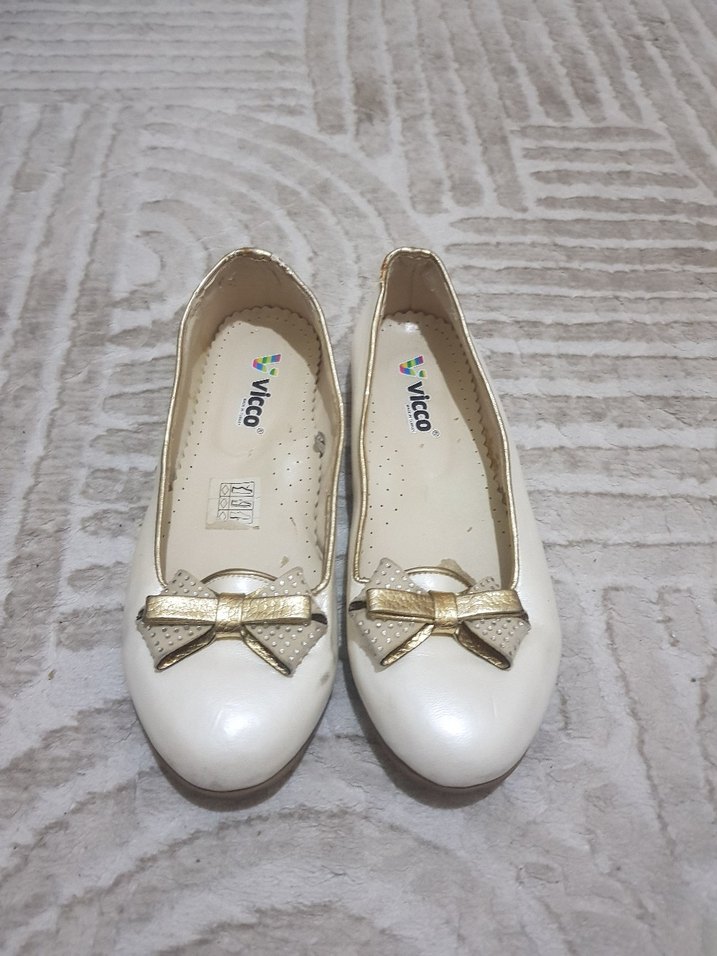 1 2 kere giyildi. Uzun süredir dolapta duruyordu. İhtiyaç fazlası. Vicco marka beyaz kız çocuk babetler, konvansiyonel tarzda, yumuşak kauçuk malzemeden ve yılan derisi desenli fiyonk detaylıdır.