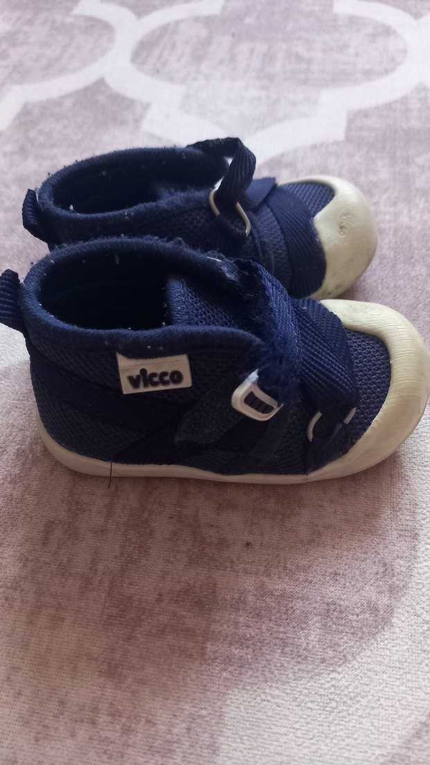 Vicco marka erkek bebek ilk adım ayakkabısı, mavi renkli ve kaymaz kauçuk tabanlıdır, cırt cırtlı kapanışı vardır.