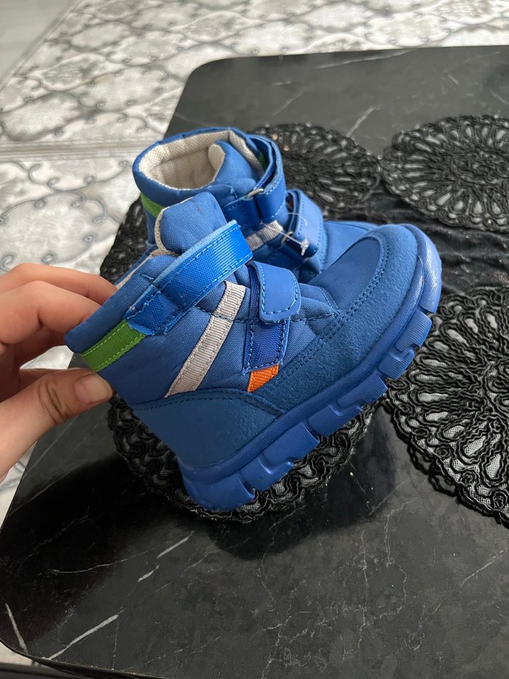 Mavi kauçuk erkek çocuk botları, renkli batik detaylara sahip. Sıfır ürün tertemizdir
