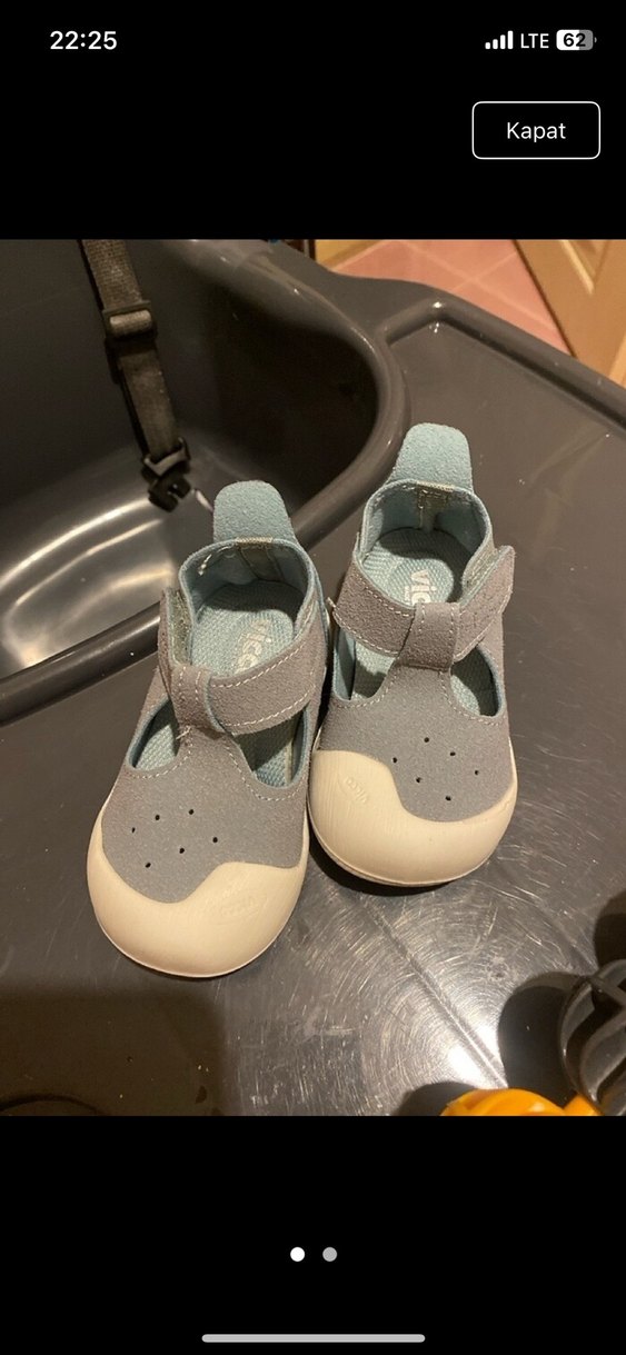 Gri renk, lastik tabanlı erkek bebek ilk adım ayakkabısı. Velcro bantlı, sade ve normcore tarzda, rahat kullanıma uygun.