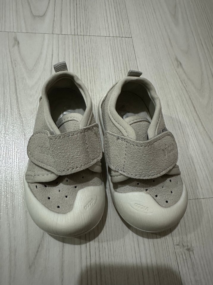 Gri ve beyaz renklerde, kaymaz kauçuk tabanlı, cırt cırtlı bebek ilk adım ayakkabısı. Düz ve sade