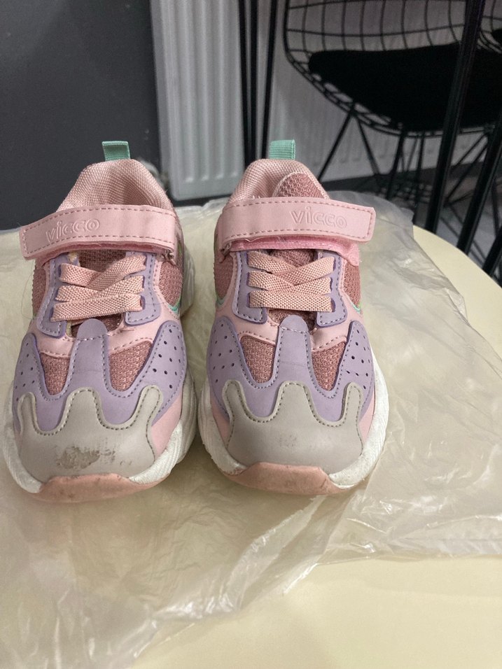 Birinin ucunda hafif soyuk var Kız çocuklar için bağcıksız, Velcro bantlı, pastel pembe tie-dye desenli spor ayakkabılar. Dayanıklı kauçuk tabanlıdır.