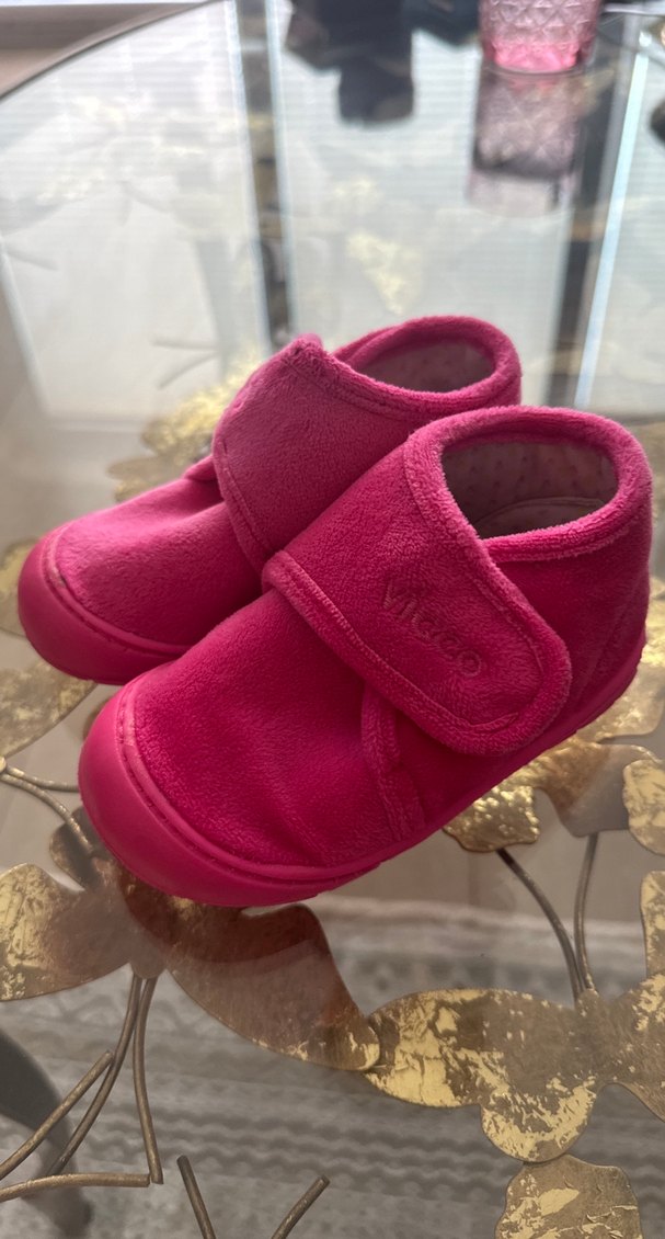 Kız çocukları için pembe, yumuşak kumaştan, kolay giyilen cırt cırtlı sıcak terlikler. Rahat ve sade tasarım.