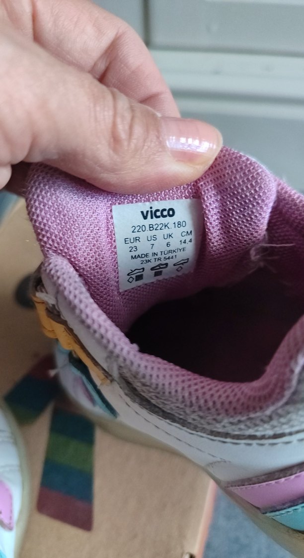 Vicco marka, pembe pastel renkli kız çocuk spor ayakkabısı. Cırt cırtlı, baskılı desenli ve kauçuk tabanlıdır. Sokak stiline uygun.burun kısmındaki sürtme hariç bir sorunu yoktur. iki ışıkta sorunsuz ve çok canlı bir şekilde yanıyor. 23 numara