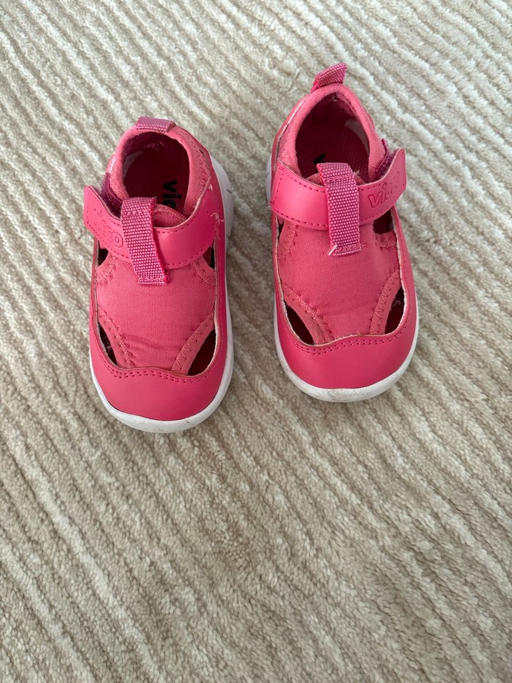 Pembe renkte, cırtlı bantlı kız çocuk sandalet. Rahat ve kullanışlı, düz renkli ve renkli tasarıma sahip. Vicco marka ve 20 numara. Kızımın ayakları tombik olduğu için bi kaç kere giyebildi sadece.