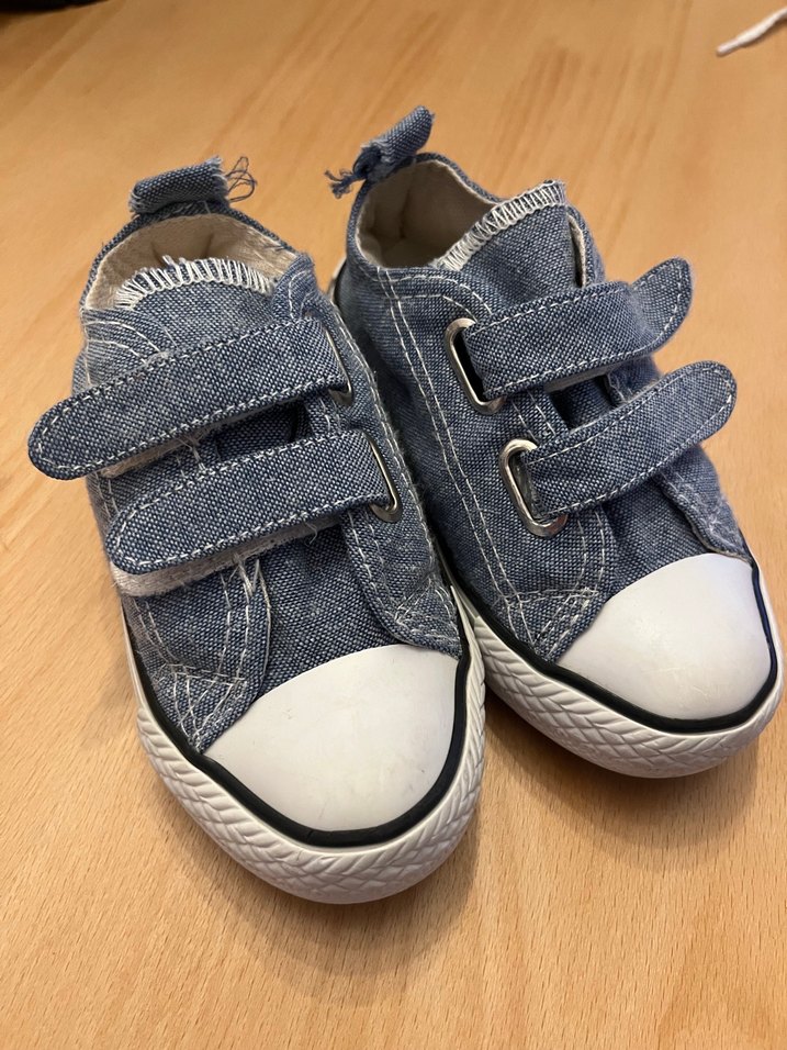 Mavi kot kumaştan, cırt cırtlı erkek çocuk spor ayakkabısı. Gri tonlarında, rahat ve sokak modası tarzında tasarlandı.