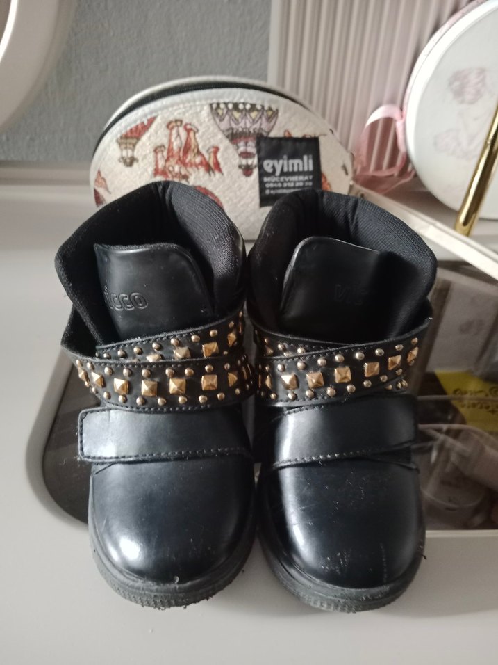 Kız çocukları için siyah kauçuk botlar, tokalı ve perçin detaylı, sokak stili ve rock punk havası taşıyor. Koyu zımba desen vıcco marka 26 numara sayılı kullanıldı yırtık yıpranma vs yok sadece silinecek
