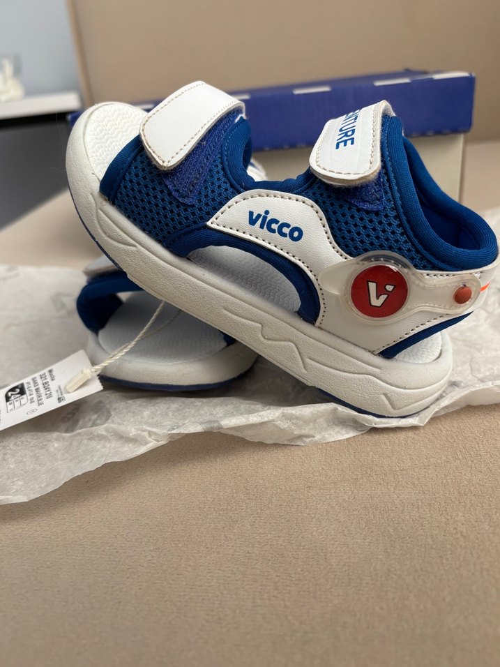 Vicco marka, mavi renkli, cırt cırtlı bantlara ve renkli desenlere sahip, kauçuk tabanlı erkek çocuk terliği.