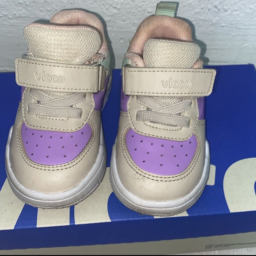 Vicco marka, pastel mor ve bej renkli, baskılı desenli kız çocuk spor ayakkabısı. Cırt cırtlı, kauçuk tabanlı, rahat ve şık sokak stili için uygun. En fazla 5 6 kere giyildi tertemiz içinden de belli oluyor sadece silinip giyilecek