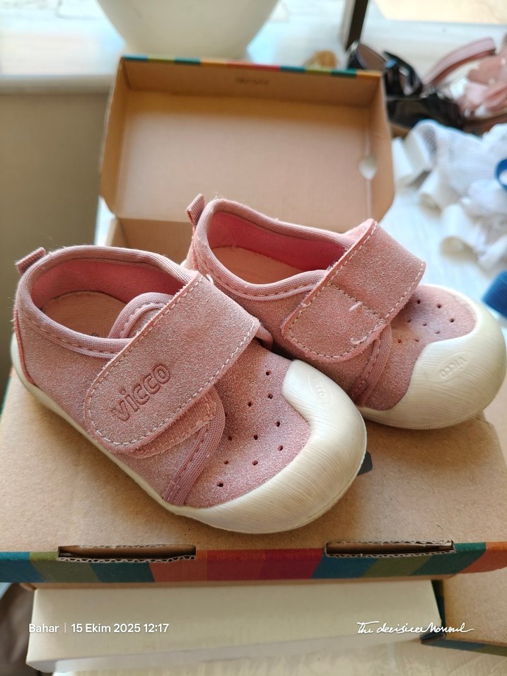 Vicco pembe ilk adım ayakkabısı, kauçuk tabanlı ve velcro bantlıdır. Pastel renk ve desen yok, rahat ve şık sokak stili için uygundur. Defosuz kutulu 21 no.