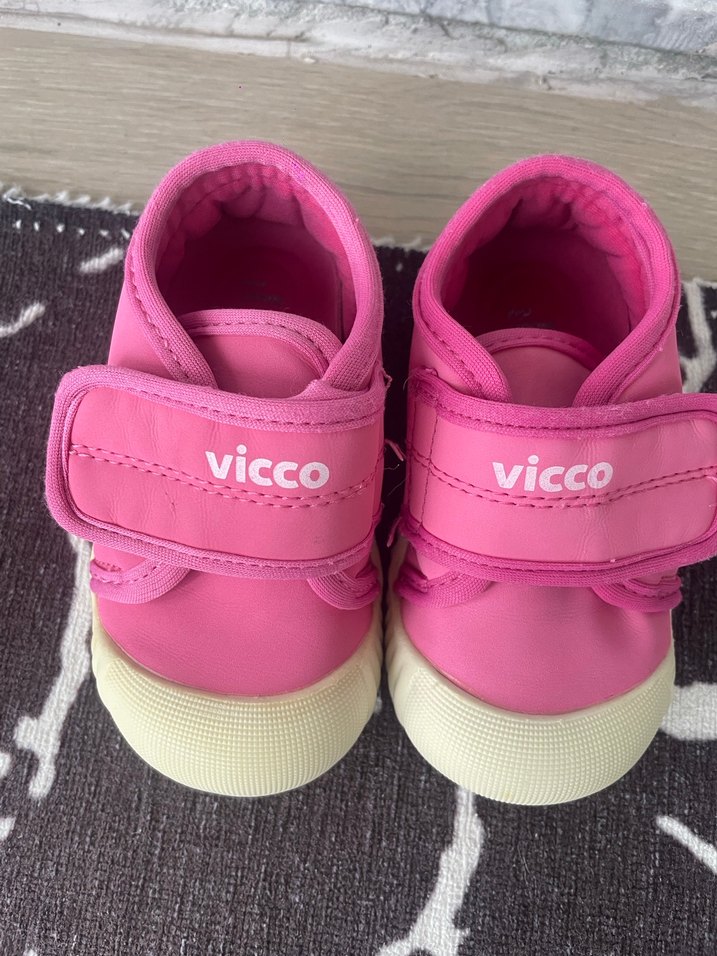 Vicco markalı, renkli baskılı pembe kız çocuk spor ayakkabısı, kolay giyilen cırt cırtlı kapama ve dayanıklı kauçuk taban içerir.