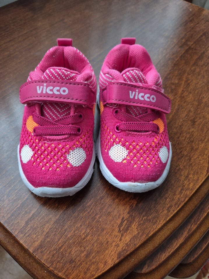 Vicco marka, renkli desenli, pembe kız çocuk spor ayakkabısı. Kauçuk tabanlı, kolay giyilen cırt cırtlı model.