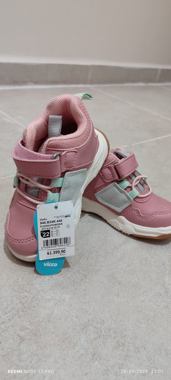 Pastel pembesi, baskılı desenli, cırt cırtlı kız çocuk spor ayakkabısı. Rahat sokak stili için kauçuk tabanlı, Vicco marka, 22 numara.