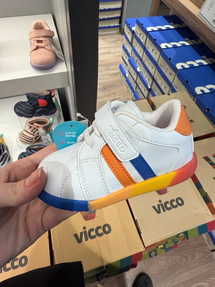 Vicco marka, beyaz tabanlı renkli baskılı ve cırt cırtlı erkek çocuk spor ayakkabısı , sadece bir kez giyildi. Ayakkabının ark akısmında iki tane küçük iz var karanlıkta flaşlı çektim net gözüksün diye çok ilgi çekmiyor ama fiyatının bu kadar uygun olma sebebi budur başka bir yerinde herhangi bir sorun yoktur