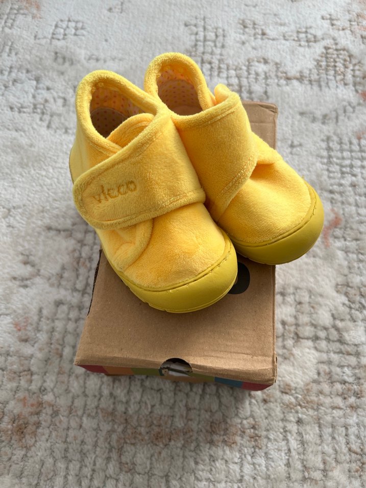 Sarı renkli, yumuşak kumaştan yapılmış ve cırt cırtlı bağlama özelliğine sahip erkek bebek ilk adım ayakkabısı. Düz ve renkli tasarım.